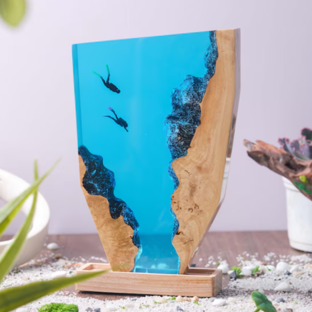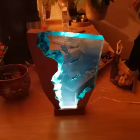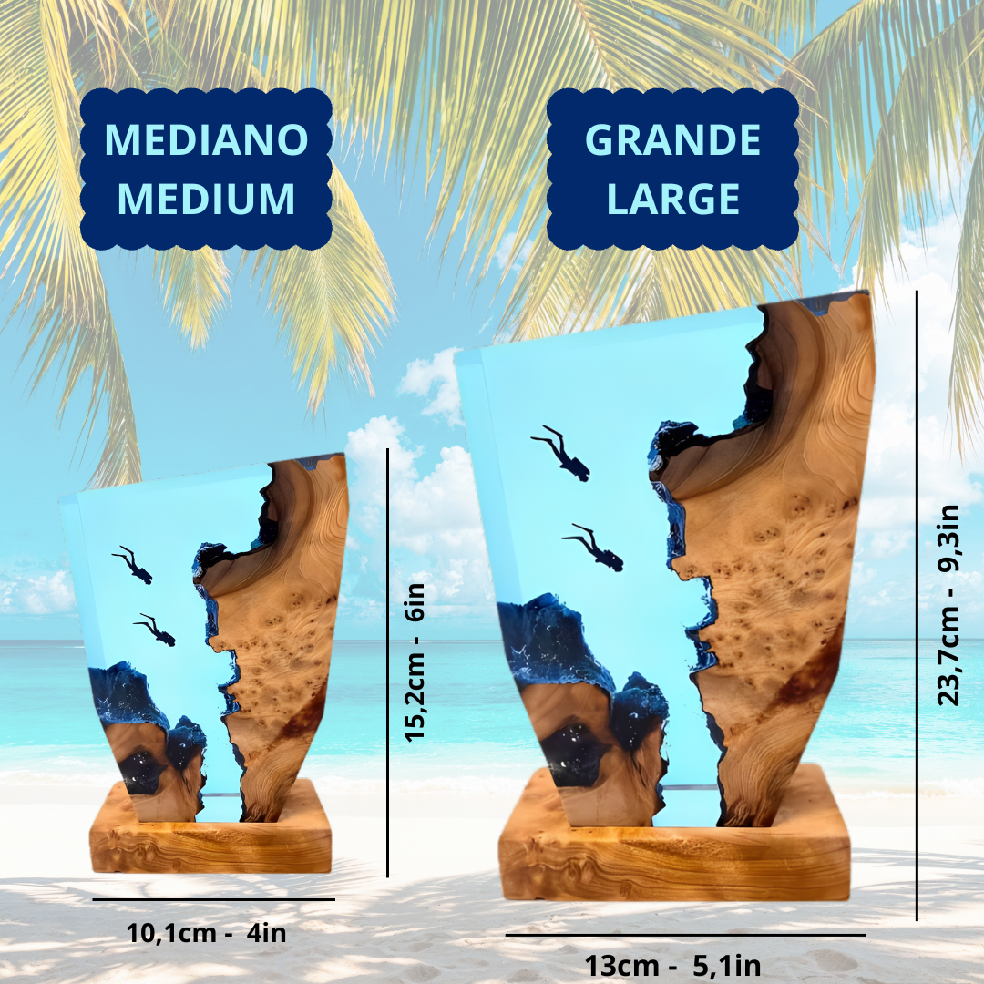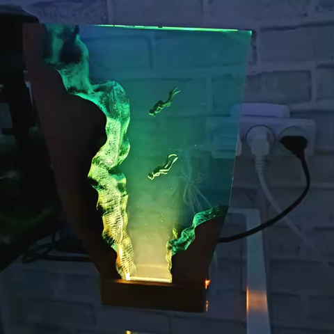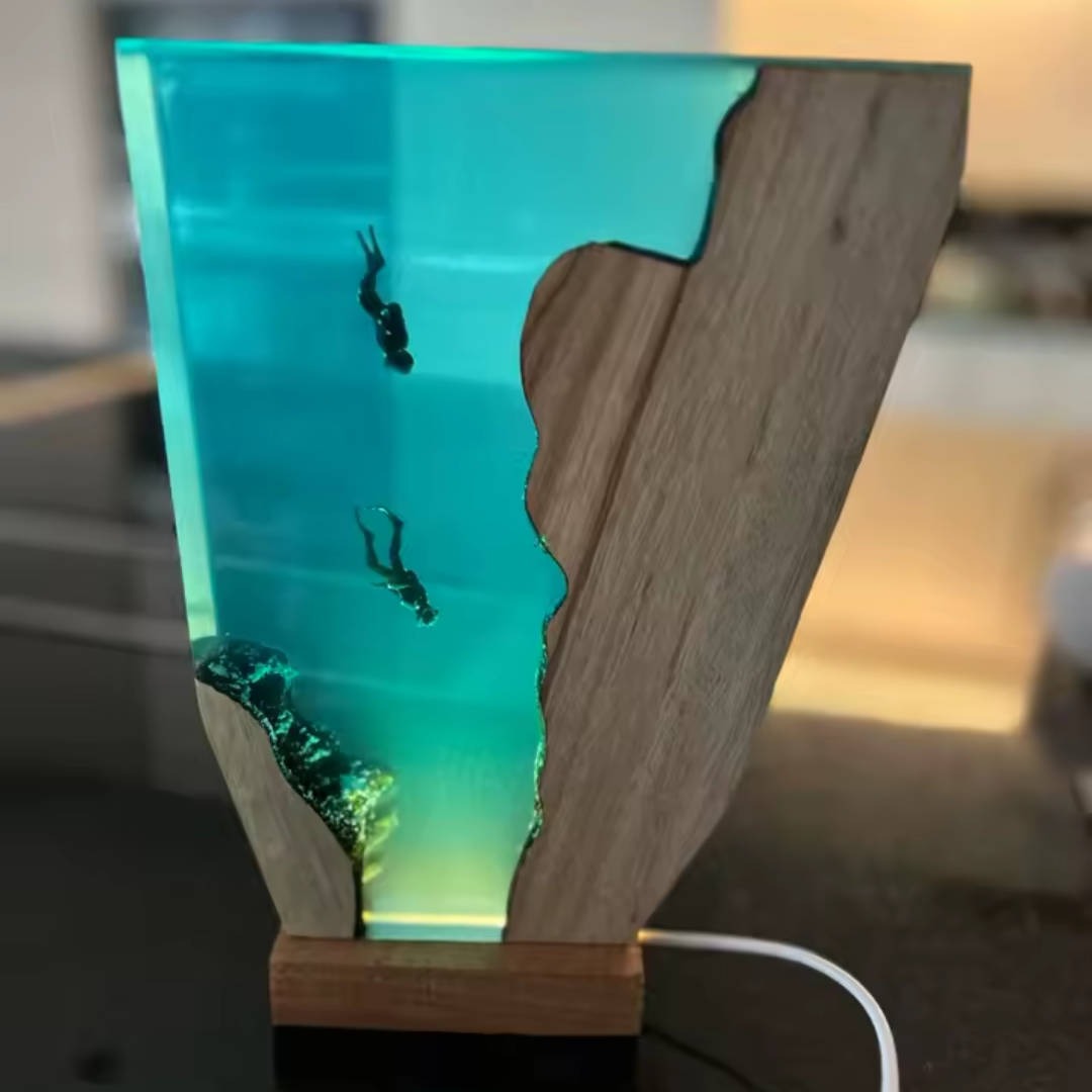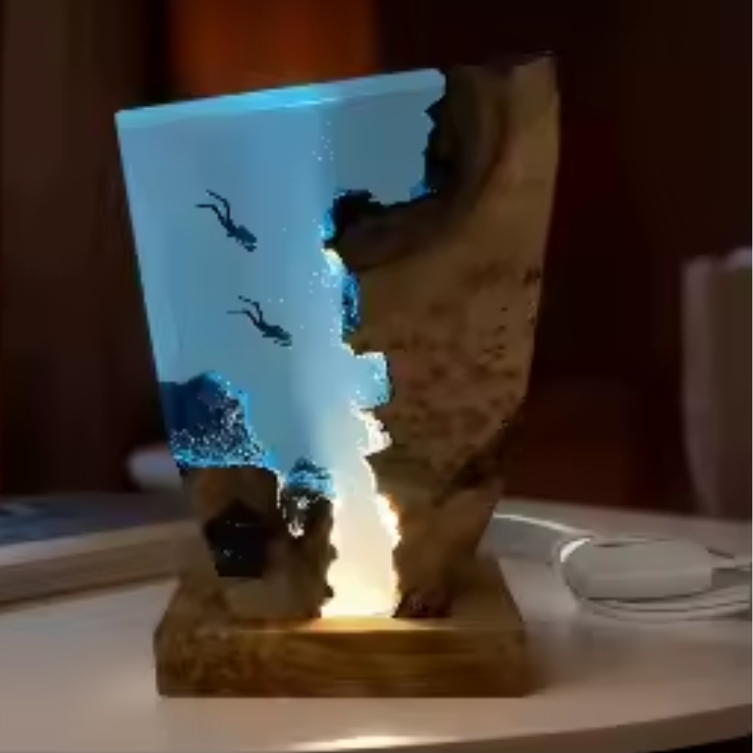 Cada lámpara está hecha a mano, utilizando resina de alta calidad y madera natural cuidadosamente tratada. No es un producto fabricado en serie: cada pieza es única, el acabado es artesanal y el diseño recrea un efecto de profundidad oceánica que no se consigue con materiales comunes.