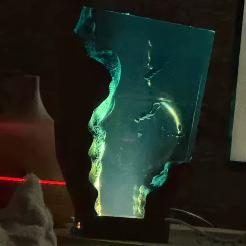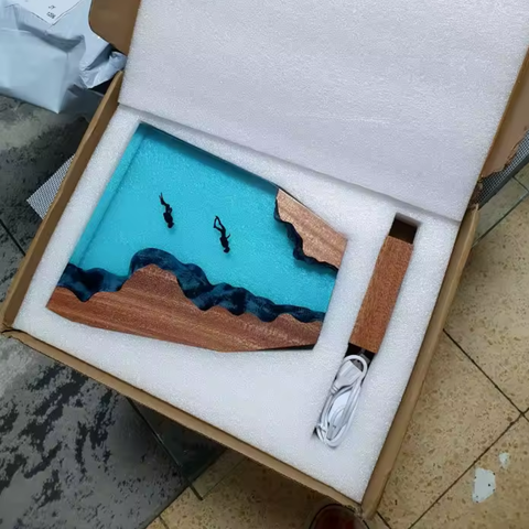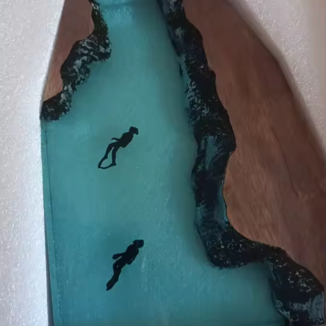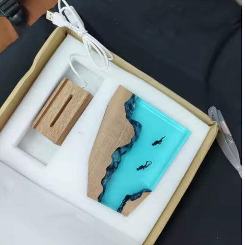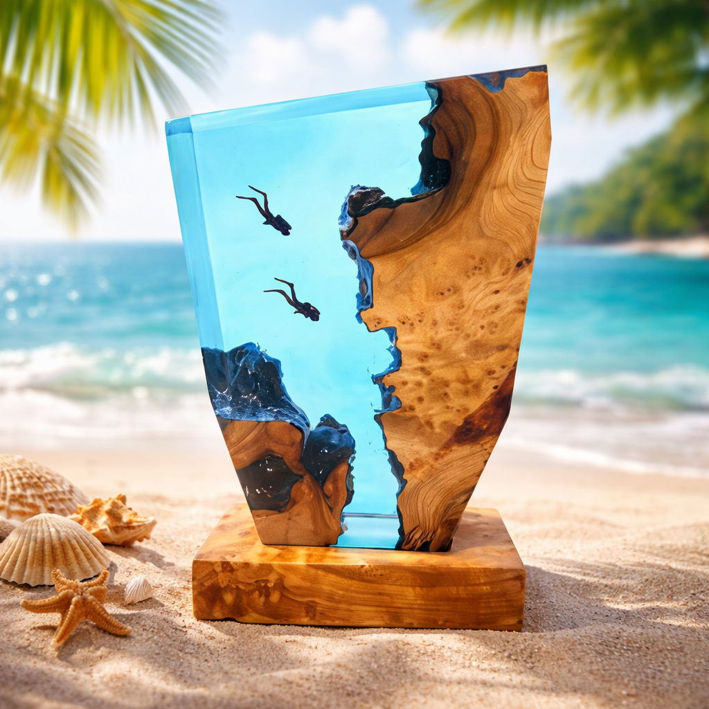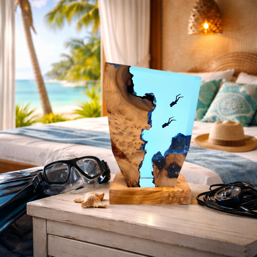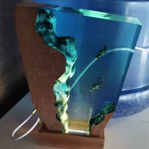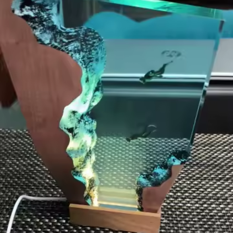 Cada lámpara está hecha a mano, utilizando resina de alta calidad y madera natural cuidadosamente tratada. No es un producto fabricado en serie: cada pieza es única, el acabado es artesanal y el diseño recrea un efecto de profundidad oceánica que no se consigue con materiales comunes.